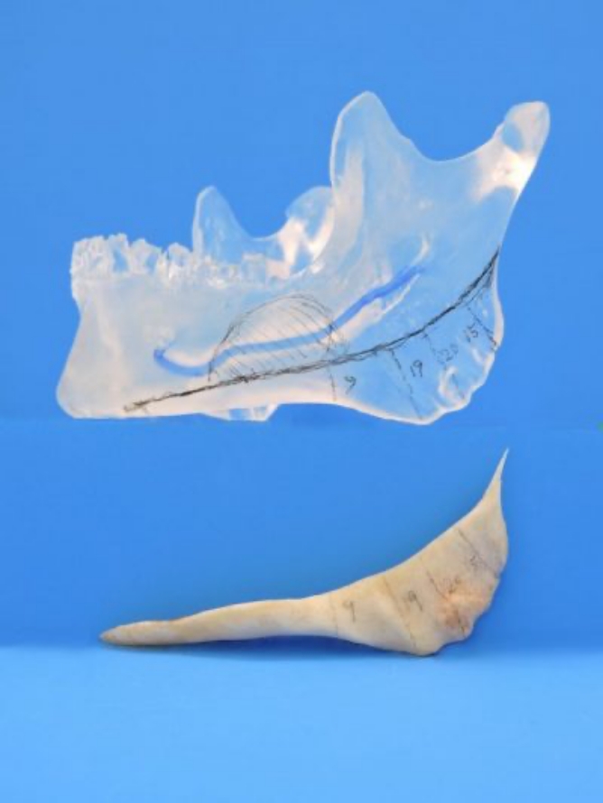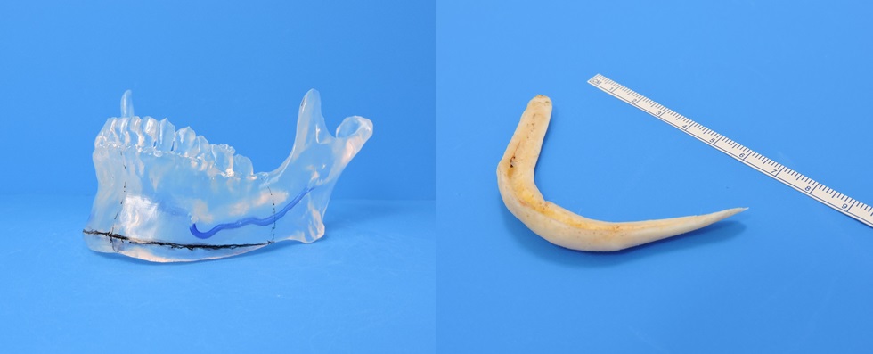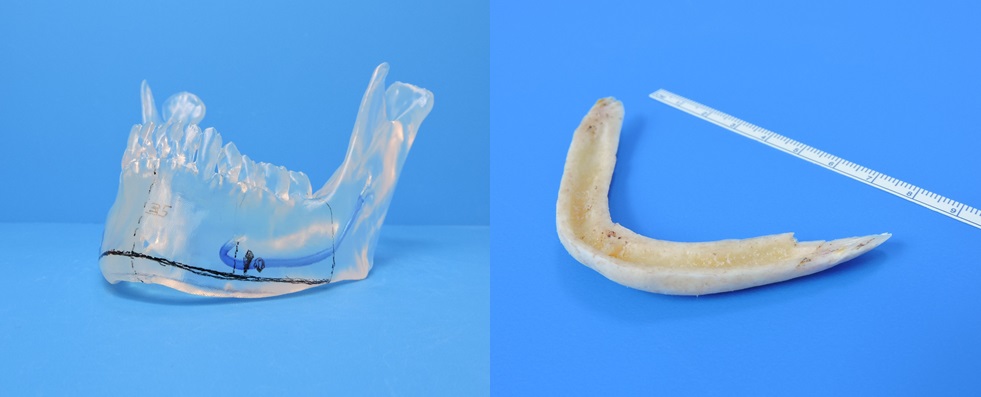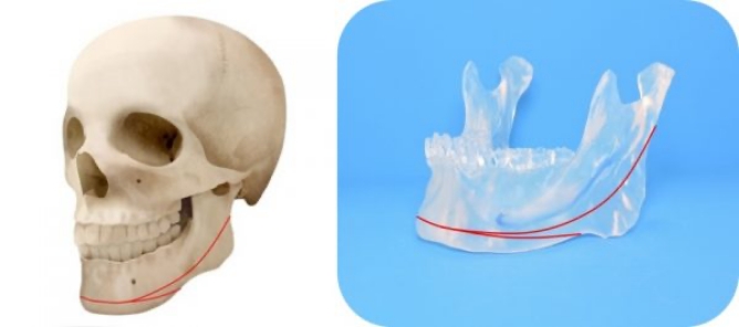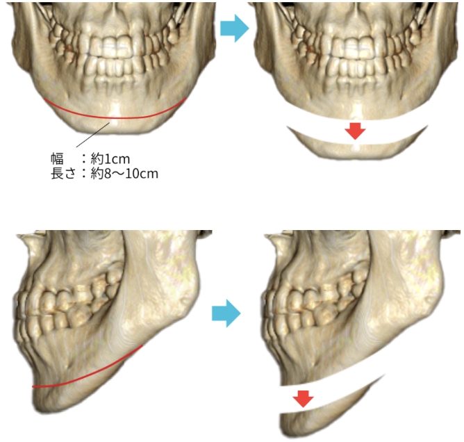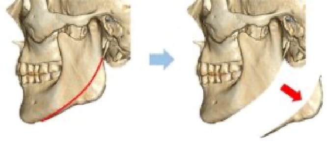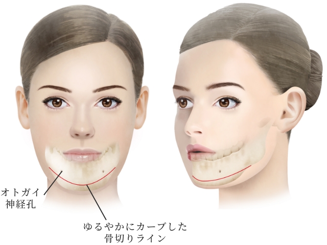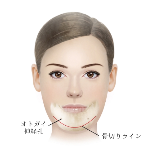 オトガイ神経を剥離して下顎骨を広範囲に露出し、神経の上下からアプローチするため、骨切り範囲がオトガイ部先端から下顎角直前におよび、切除幅8㎝~10㎝、全長14cm~16cmと非常に大きい。