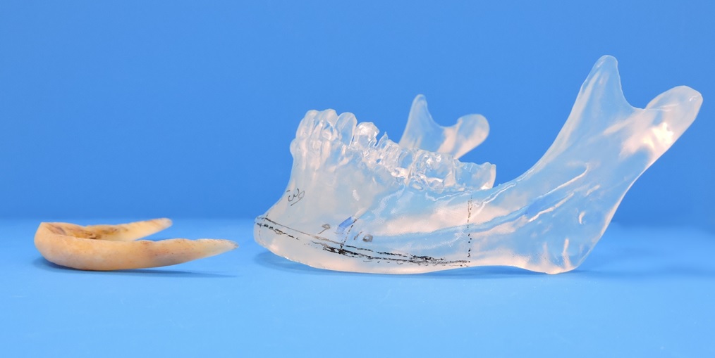 3D-CTのデータを用いて3Dの立体模型を作成し、理想のフェイスラインになるよう神経の位置を確認して最大限の骨切りを実現します。立体模型での術前シミュレーションで詳細な手術プランを立てるとともに、オペ室に設置した大型モニターで術前写真や3D-CT画像を確認しながら施術することで、より精度の高い手術を可能にしています。