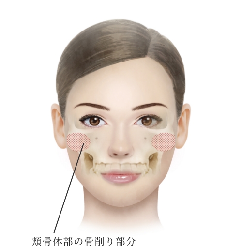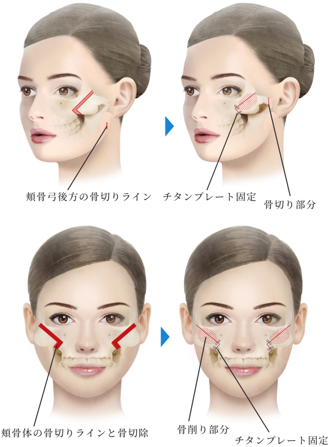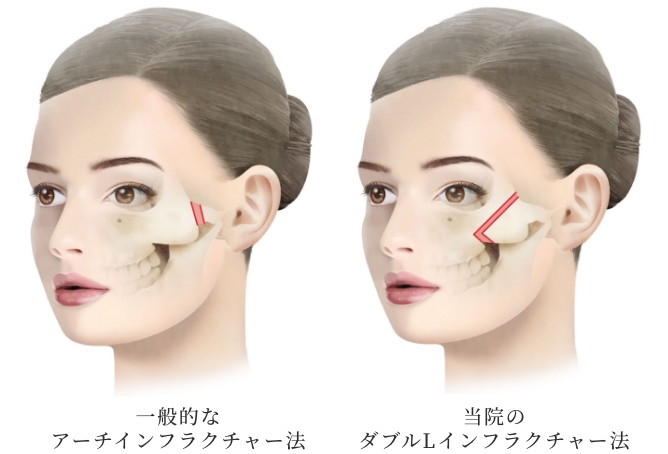 骨切り部位は頬骨弓部から体部前面に至り、L字型に長く幅広く切除し頬骨全体を内下方へ移動するため、頬骨全体に縮小効果があります。L字型に合計4回の骨切りが必要なため、複雑で精密な手技が必要な施術です。